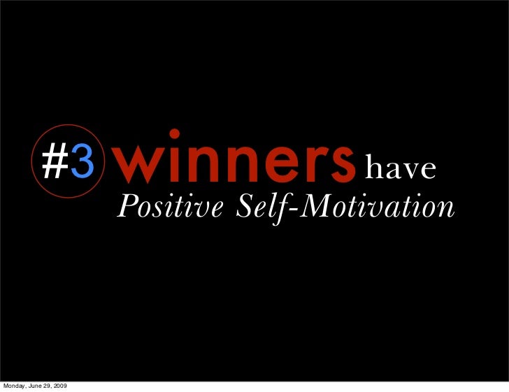 True winners don't go for less, they go for more. They find motivation in small things and not just big things. Motivation is all about big and small opportunities. They learn new skills through hard task, tasks theyve never had before. You learn and you use those new skills for the future. You motivate yourself to do better and to learn new things. Winning isnt just about the tittle, its about knowing you actually out effort in something you had no idea you would be able to do. Its about finding motivation in a lot of things. There is nothing better than having positive self motivation because it lifts you up to becoming a better person. You achieve alot more with your own motivation.